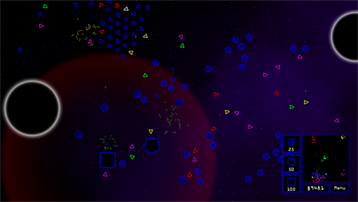We have an interesting and colourful project for you to take a look at, people. Seemingly a hybrid between Geometry Wars and Terminal Orbit, this game - Eternal Orbit has been two months in the making and already is looking very promising. The author, SolarB promises custom game types and between 500 and 1000 computer controlled units. Which is quite a lot.